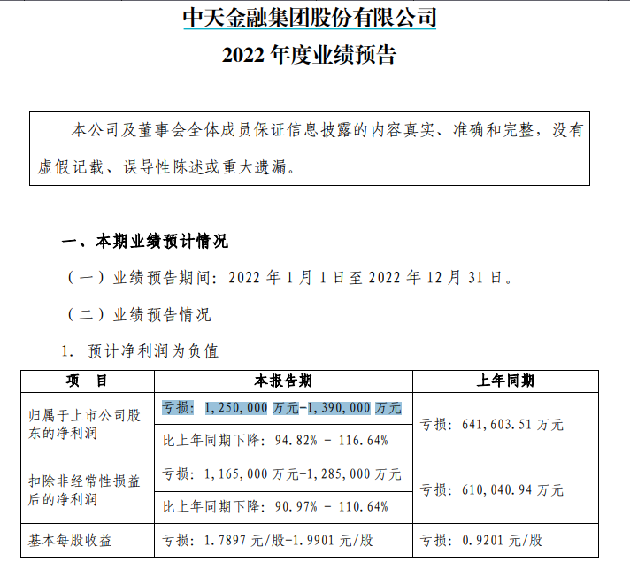 昨晚,中天金融发布的业绩预告显示,公司预计2022年度预亏超百亿元。