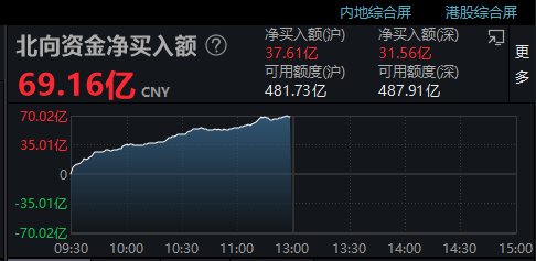 北向资金方面,今天上午继续净买入,半个交易日净买入约69亿元。